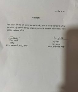 काठमाडौँ । मधेश प्रदेशको राजनीतिमा प्रभावशाली भूमिका खेल्दै आएका दुई शक्ति, जनता समाजवादी पार्टी (जसपा), नेपाल र जनता समाजवादी पार्टीबीच औपचारिक रूपमा एकता भएको छ।