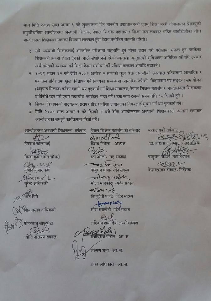 ४. मिति २०७४ साल असार ९ गते दिनको ४ बजेदेखि आन्दोलनरत अस्थायी शिक्षकहरुले अनशन लगायतका आन्दोलनका सम्पूर्ण कार्यक्रम फिर्ता गर्ने ।