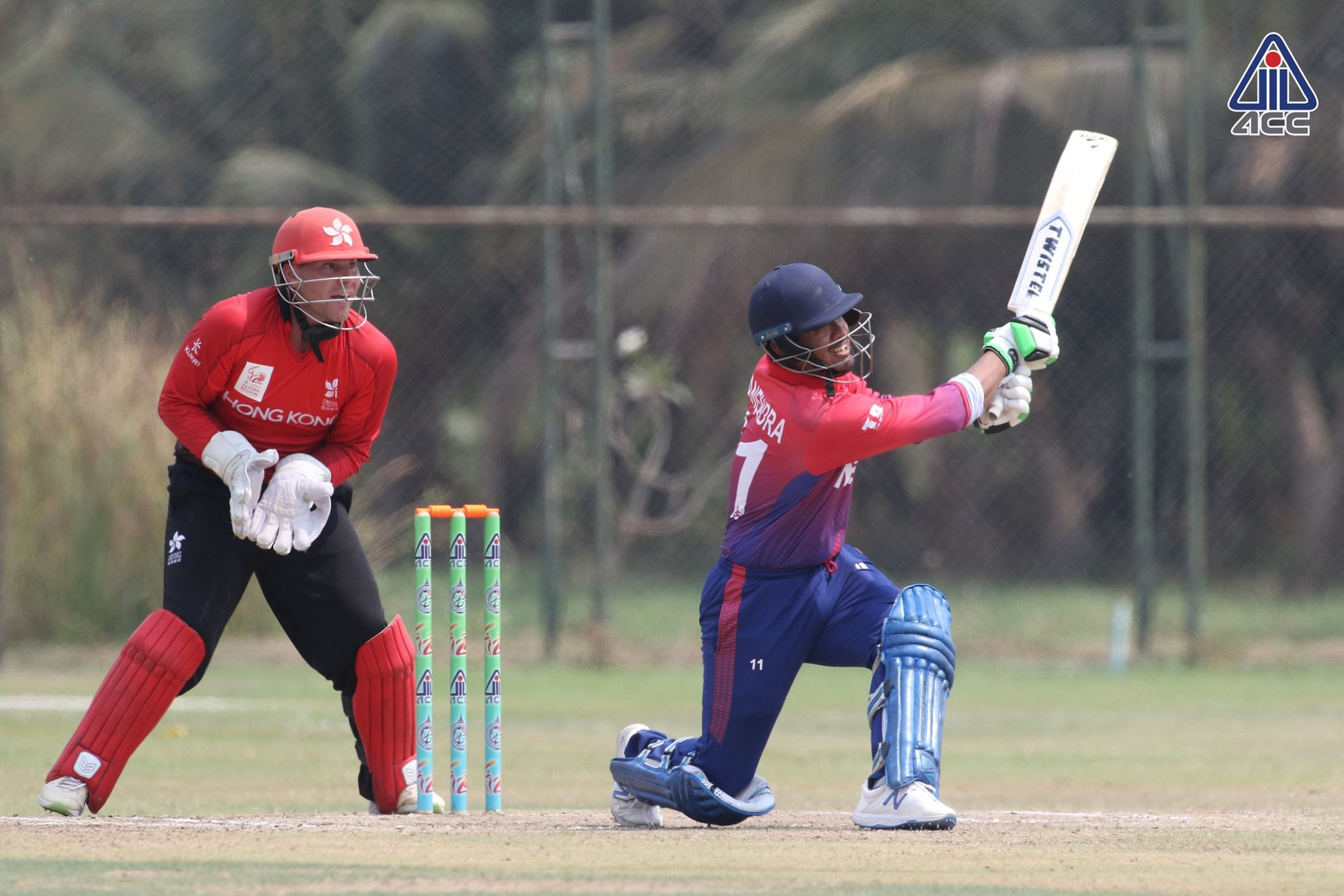 यस्तै अविनाश बोहराले १२ रन जोड्दा आरिफ शेखले १० रन बनाए । करण केसीले ७ रनमा आउट भए । त्यस्तै विनोद भण्डारी र दिपेन्द्र सिंह ऐरी ५–५ रनमा आउट हुँदा पारस खड्का ४ रनमा पेभेलियन फर्किए । पवन सर्राफ १ रनमा आउट हुँदा सन्दीप लामिछाने सुन्य रनमा आउट भए । हङकङका हरुन मोहमद अर्सादले ५ विकेट लिए । यस्तै अफ्ताफ हुसेनले ३ तथा इशान खानले २ विकेट लिए । यस अघि टस हारेर पहिले ब्याटिङ गरेको हङकङले २० ओभरमा ६ विकेट गुमाएर १ सय ५४ रन बनाएको थियो ।