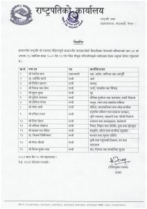 राष्ट्रपति कार्यालयद्वारा सार्वजनिक विज्ञप्ति अनुसार नयाँ वरियता र कार्यविभाजन यस प्रकार छ: